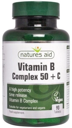 - Kompleks witamin z grupy B Natures Aid dostarczający również 50 mg witaminy C. Witaminy z grupy B przyczyniają się do redukcji zmęczenia, normalizacji funkcjonowania układu nerwowego, normalizacji metabolizmu.