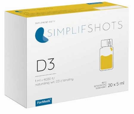 SIMPLIFSHOTS D3 to suplement diety w formie płynnej. Kartonik SIMPLIFSHOTS D3 zawiera 20 szklanych buteleczek, po 5 ml każda. 1 buteleczka (5ml) to 20 000 IU naturalnej witaminy D3 z lanoliny.