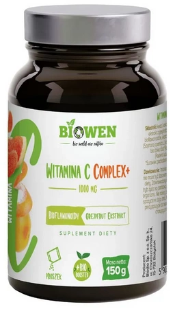 Witamina C Complex + składa się na takie składniki jak: Witamina C (kwas l-askorbinowy, askorbinian sodu), BIO dzika róża, ekstrakt z grejpfruta, ekstrakt z perełkowca japońskiego z rutyną, a wszystkie składniki są sproszkowane.