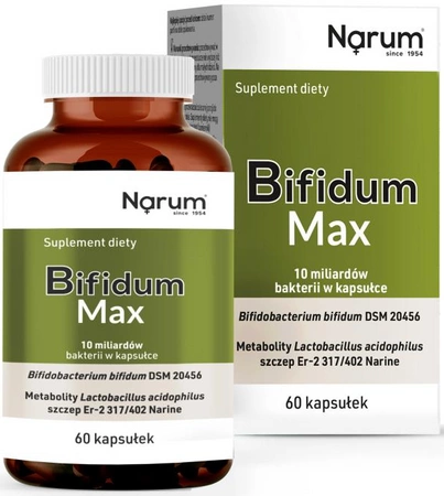 Bifidum Max to suplement diety w kapsułkach dla dorosłych i dzieci od 3. roku życia zawierający szczep Bifidobacterium bifidum DSM 20456 oraz metabolity bakterii Lactobacillus acidophilus szczep