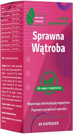 Składniki roślinne zawarte w produkcie wspomagają detoksykację organizmu, wspierają i poprawiają sprawność wątroby.