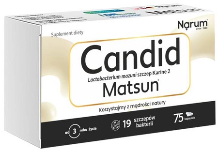 Candid Matsun to suplement diety w kapsułkach zawierający metabolity bakterii Lactobacterium mazuni szczep Karine 2 oraz żywe kultury bakterii Lactobacterium mazuni szczep Karine 2, czyli kompozycję 19 szczepów bakterii.
